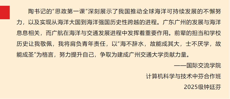陶韶菁的授课紧紧围绕海洋强国与交通强国战略,从“领航定向”“时代机遇”“广航贡献”和“新生使命”四个方面深入浅出地阐述了新时代青年应如何与时代同进步、与祖国共成长,既有理论指引,又有数据支撑、案例佐证,更饱含着对青年学生的深情关怀。